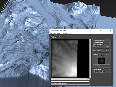 DreamScape Terra具有先进的地形操纵功能。用户可以在高程地图上绘画,从而使地形更高或更低,改变山坡或应用地形侵蚀。